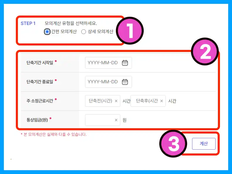 STEP 2. 단축기간 시작일과 종료일, 주 소정근로시간, 통상임금을 입력하세요